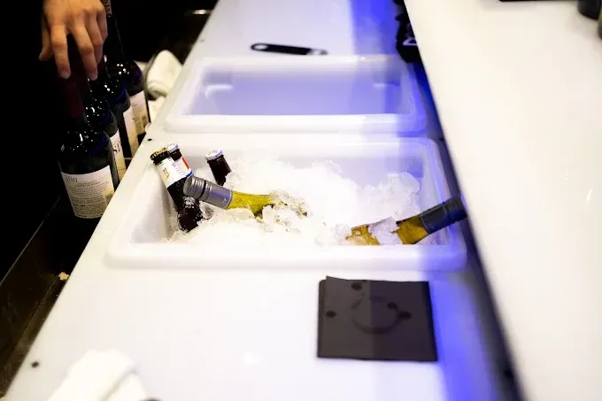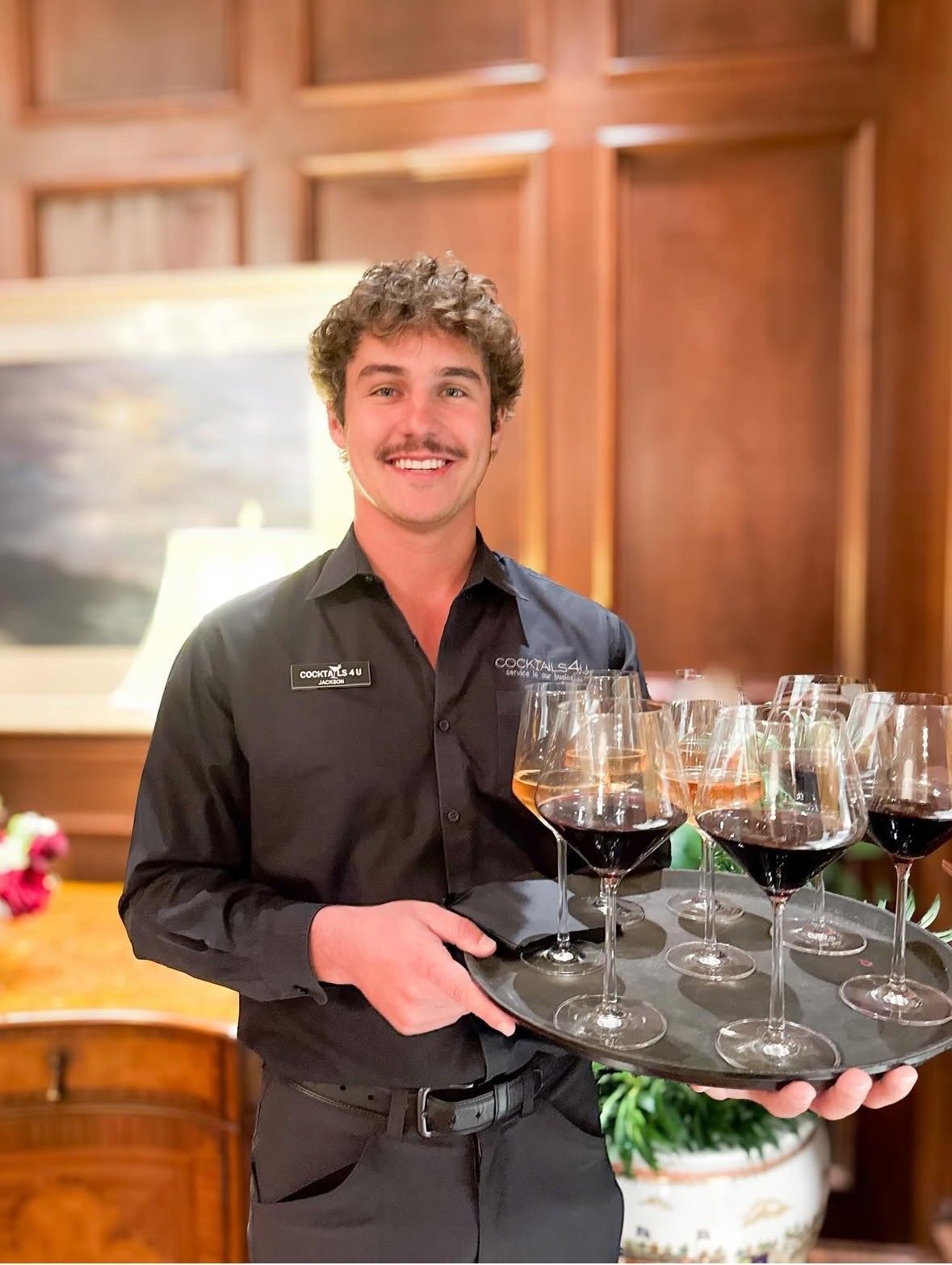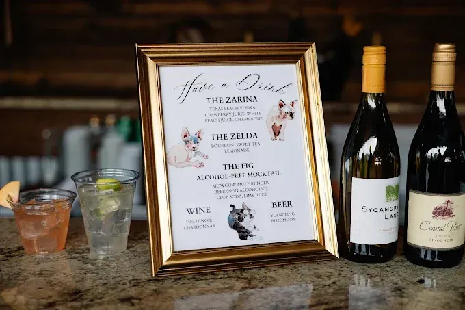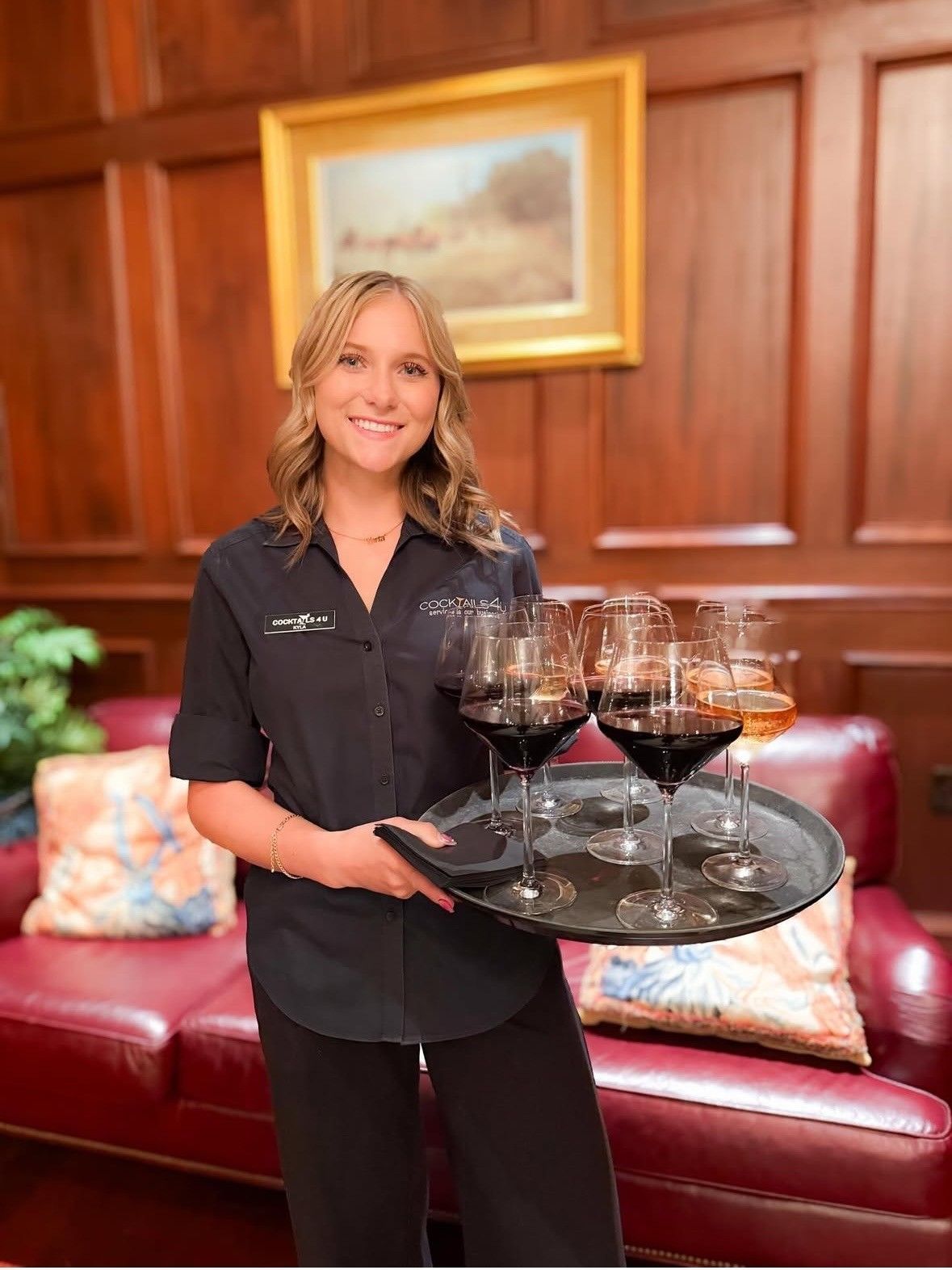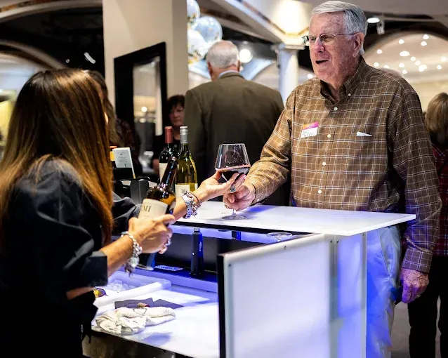 • A woman is holding a glass of wine at a table with balloons in the background.