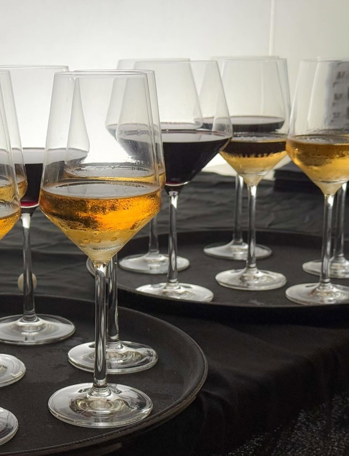 • A woman is kissing another woman on the cheek while holding a glass of wine.